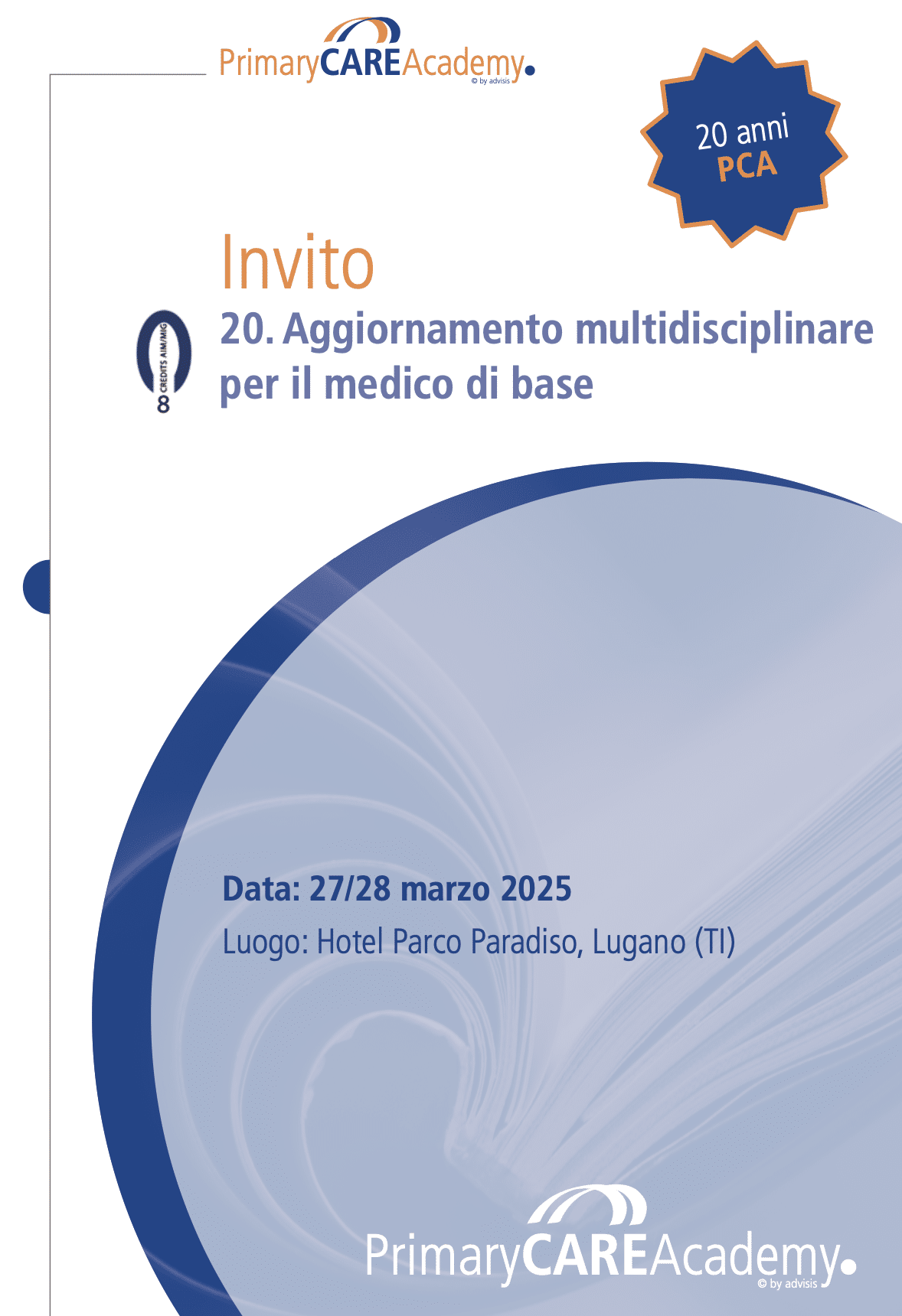 Ti invitiamo cordialmente alla formazione continua «Primary Care Academy» (PCA) 2025. Questa manifestazione è giunta alla 12° edizione in Ticino e si svolge anche nelle altre tre regioni linguistiche del nostro paese. La ditta Advisis AG è l’affermato organizzatore di questo evento di formazione, che nello stesso tempo permette un legame neutro e indipendente tra sponsor e medici.